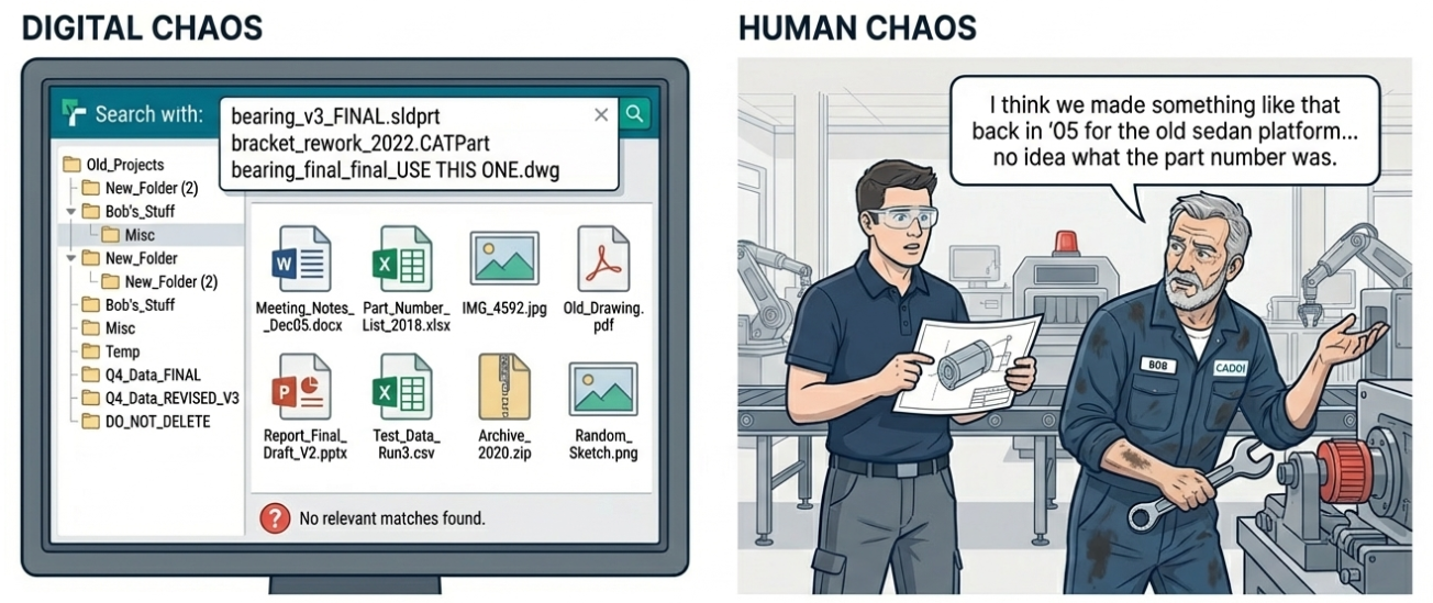 The Challenge: Manufacturing Engineers act as a generational buffer, struggling to translate the deep, unwritten "tribal knowledge" of retiring veterans into formats usable by digital-native new hires. This knowledge drain results in long, inefficient onboarding times, where new hires struggle to navigate the company’s vast and disorganized design history.
