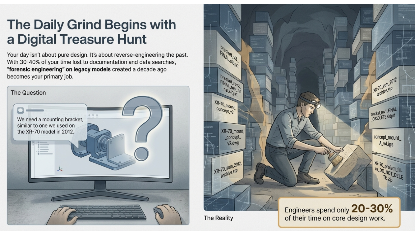 The Challenge: Due to constant context switching and time spent on administrative tasks—such as processing documentation and manually searching through files—Design Engineers only dedicate 20-30% of their time to core CAD work. Tasks like identifying and organizing relevant data for design, manufacturing, and purchasing consume valuable hours.