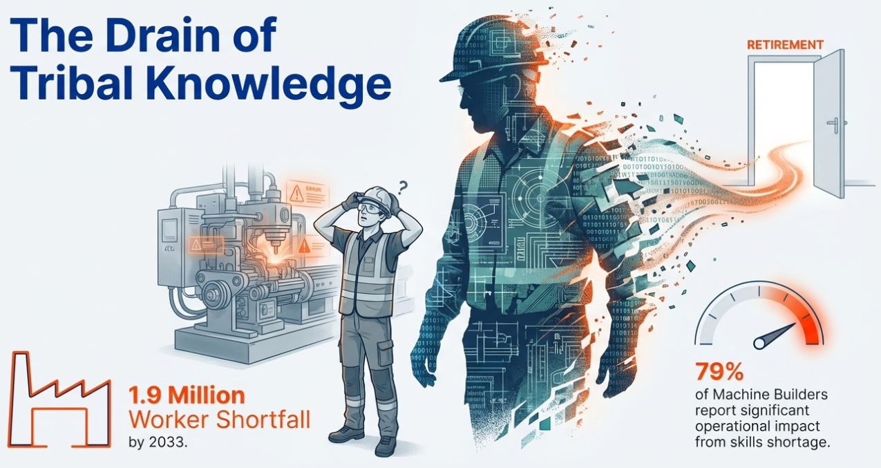 Why It Matters Now: Up to 79% of machine builders report that the skills shortage is significantly impacting operations. When a veteran maintenance tech or engineer retires, the "source code" of the plant’s operations often leaves with them, causing reliability to plummet.