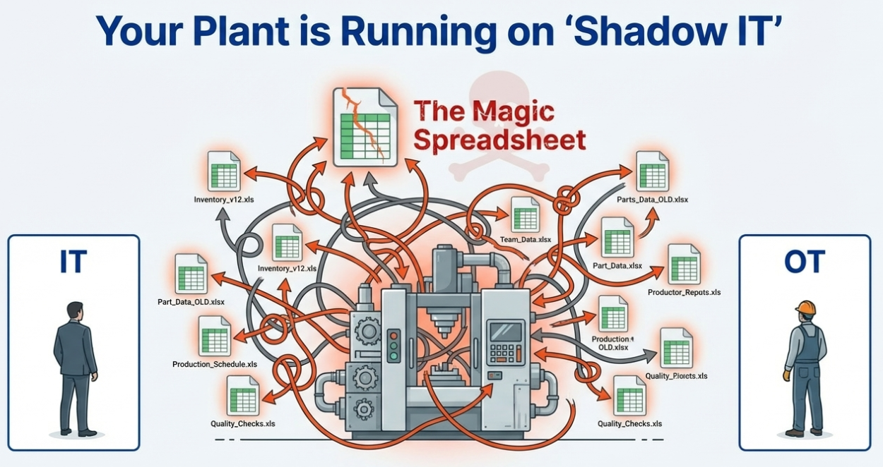 The Challenge: There is a profound cultural and technical collision between IT departments (focused on security/patching) and OT teams (focused on uptime). Because monolithic enterprise systems are often too rigid for the shop floor, managers retreat to "Shadow IT"—macro-laden Excel spreadsheets that run the plant but have no version control or backups.