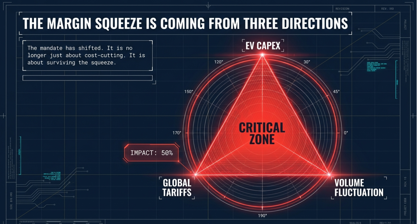 The Challenge: Automotive OEMs and Tier-1 suppliers face aggressive cost-down mandates—often a 3% annual reduction—to keep programs viable. This is existential during the EV transition, as electric platforms typically generate lower margins per vehicle despite requiring higher initial capital investment.
