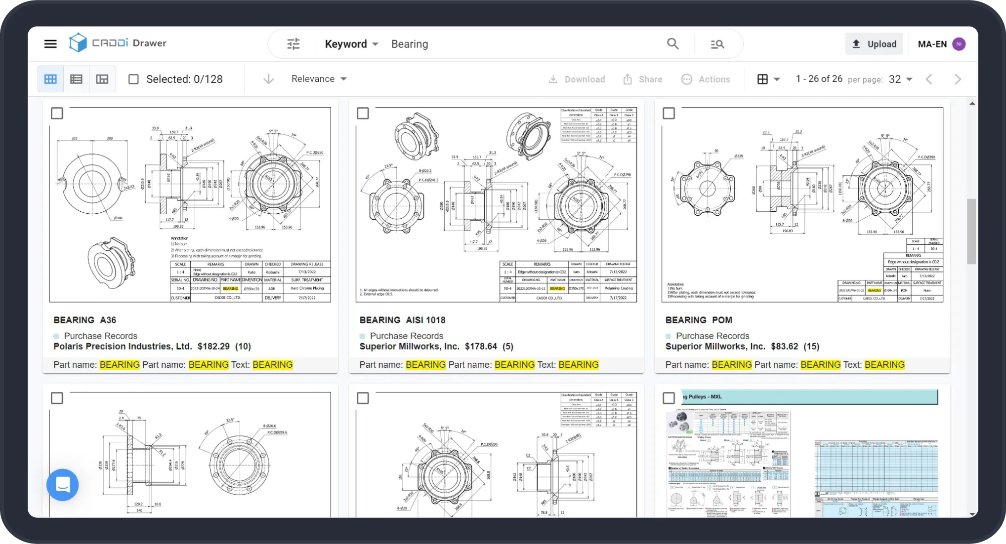 Upload BOM data, ERP, and QMS data into CADDi and link it to your drawings and documents so you can find everything in one place.