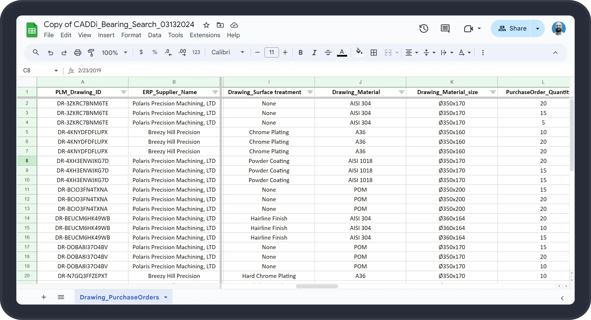 CADDi makes it intuitive and fast to explore your past data in helpful ways. Search using any aspect of a part – from the components of the design, to the materials used, to comments left by other engineers. Then see all the relevant data about each part, all in one location. Important but difficult questions like “what is the average defect rate of component parts we receive from each of our suppliers?” or “how much more do we typically pay for parts made of each material?” normally take expertise or hours of manually cross-referencing to answer. With CADDi, even a brand new hire can find the correct answer in a couple minutes.